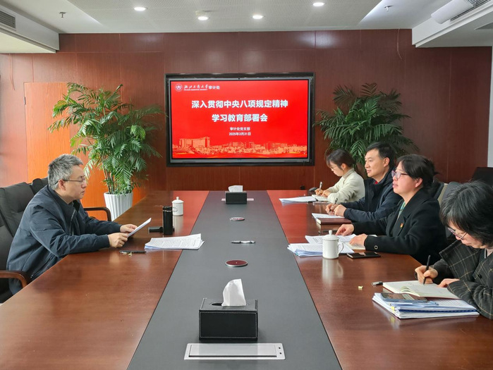 3月31日下午,为深入学习习近平总书记关于深入贯彻中央八项规定精神学习教育的重要讲话和重要指示精神,以及省委、省委教育工委部署会议有关要求,审计处党支部在综合楼九楼第五会议室召开“深入贯彻中央八项规定精神学习教育”部署会,支部党员、校长王永贵参加支部集体学习,并讲授专题党课《不能触碰的红线》。